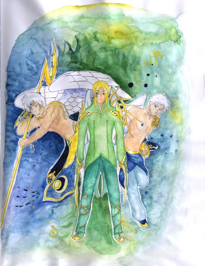 Ja, grün. Das passiert, wenn Anudais auch nur EINMAL im Vordergrund stehen will. Dummerweise ist mein Zeichenblock nicht für Aquarell geeignet und hat sich dementsprechend gewellt. Dann war das Bild auch noch Din A3. *schauder* Es war eine Plage. Und das ganze nur, weil Sadi Geburtstag hatte. (also jetzt die reale Person zu Sadi, nicht Sadira selber, die hat ja am 19.08. Geburtstag.) Angefertigt zum 12.02.06 |