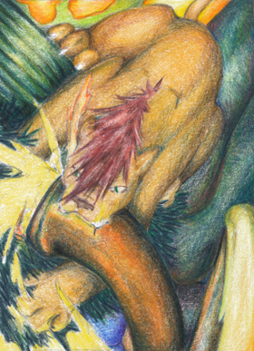 Ein Knurren, ein Brüllen und mit einem mächtigen Sprung versenkte die Raubkatze Krallen und Reißzähne in die linke Greifschere des Insekts. Ein lautes Knacken war zu hören, das Brechen eines Panzers, Reißen von weichem Fleisch, als die Katze sich mit jedem Muskel ihres Körpers gegen ihre Beute stemmte. Sie brach die Zange heraus, als wäre sie das Bein eines Hummers. Jedoch war dieser Hummer voll gelber Flüssigkeit, die hervorsprudelte. Das Insekt hisste und versuchte nach dem Angreifer zu schnappen. Es senkte seinen Oberkörper und begann sich um sich selbst zu drehen. Mellagan ergriff die Chance. Er packte Temminck um den Oberkörper und zerrte ihn weg von dem Monstrum, dessen Beine gefährlich nah neben ihnen auf den Boden schlugen. Temminck blutete am Kopf und an diversen anderen Stellen und schien nicht ganz bei Bewusstsein. Mellagan hörte auf einmal die Elfe lachen. Sie zog sich mit beiden Händen über den Rücken des Insekts. Ihre Messer hatte sie nicht mehr. Aufhören mit dem Lachen wollte sie auch nicht Trotz ihrer immer noch hochgefährlichen Situation überkam Mellagan eine Panik, die er noch nie zuvor gespürt hatte. Er raffte sich Temmincks Arm über die Schulter.